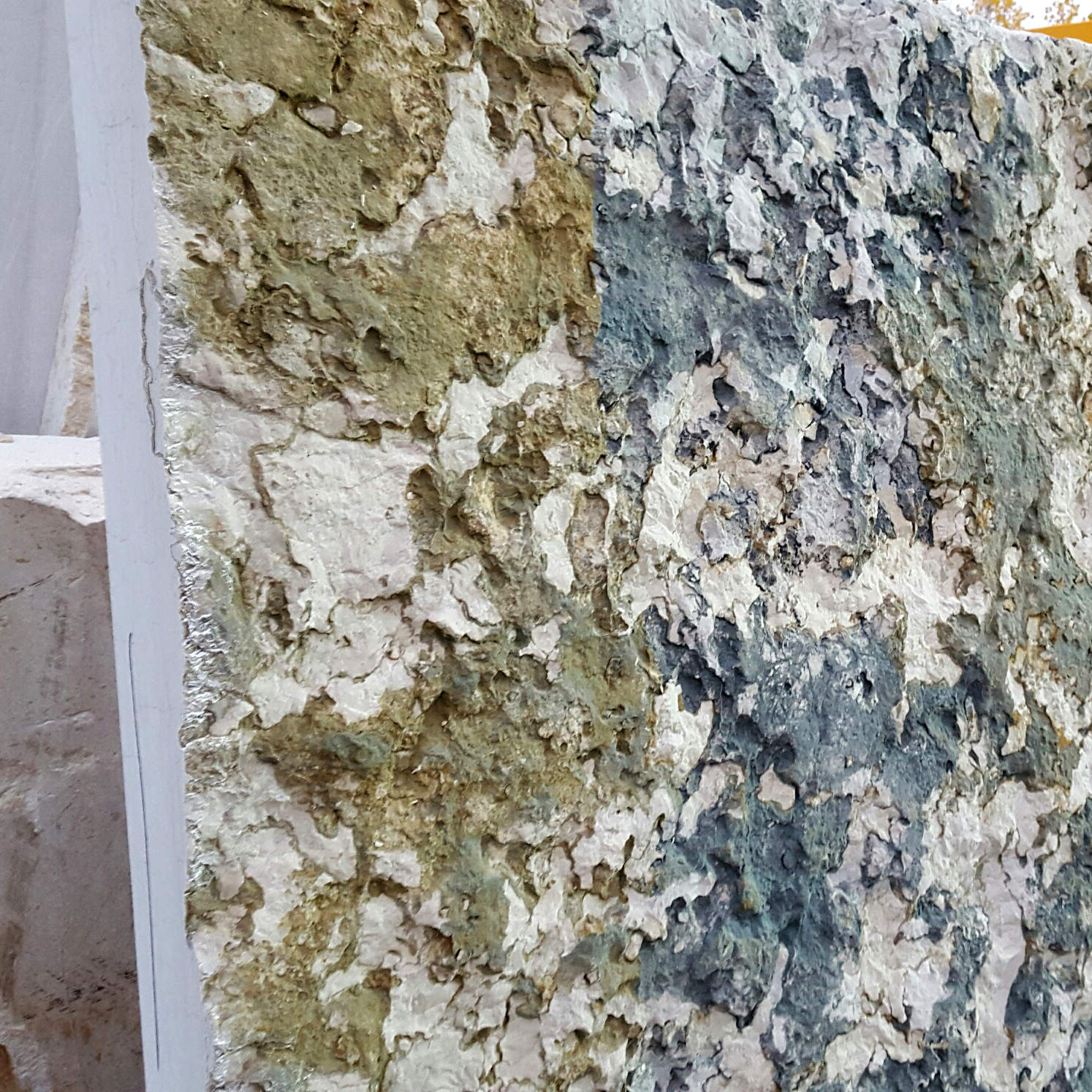 La finition de surface est tout naturellement celle de la croûte de pierre, avec la variabilité de couleurs et de relief :